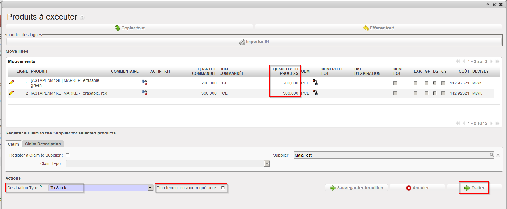 3. Sur l’écran “Produits à Traiter”, complétez les lignes réceptionnées, modifiez le “Destination Type” de “To Cross Docking” à “To Stock” (vous apercevez un message d’avertissement, cliquez sur “OK”) et décochez la case “Directement en zone requérante”.