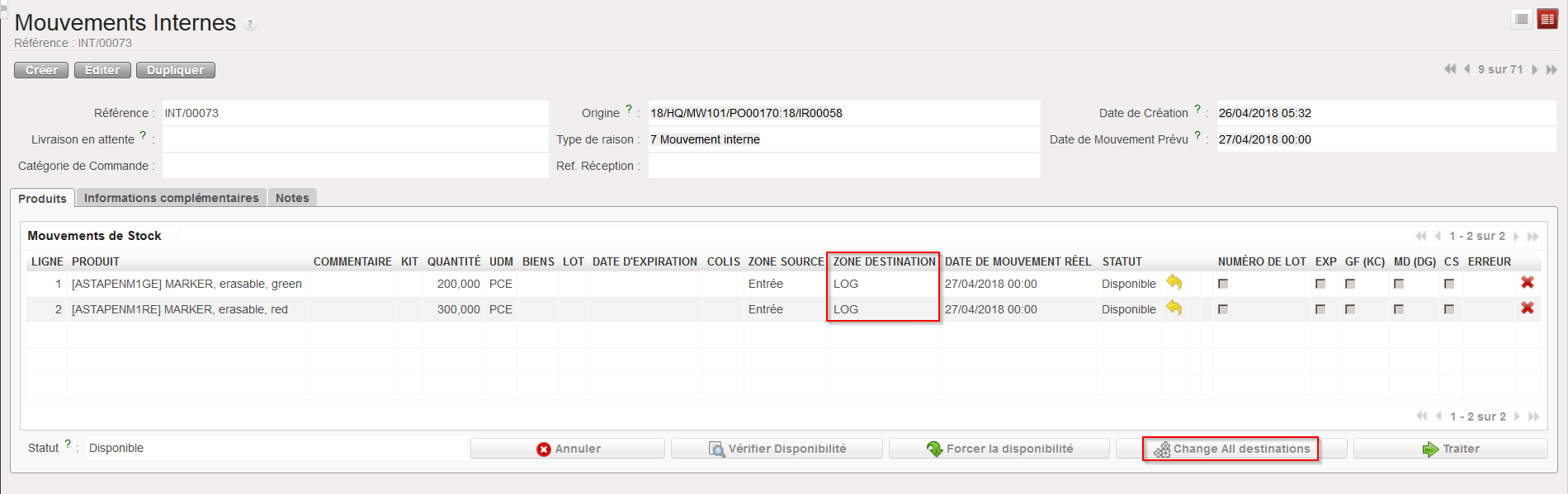 5. Ouvrez le Mouvement Interne. Notez que la zone destination des marchandises est “LOG”.