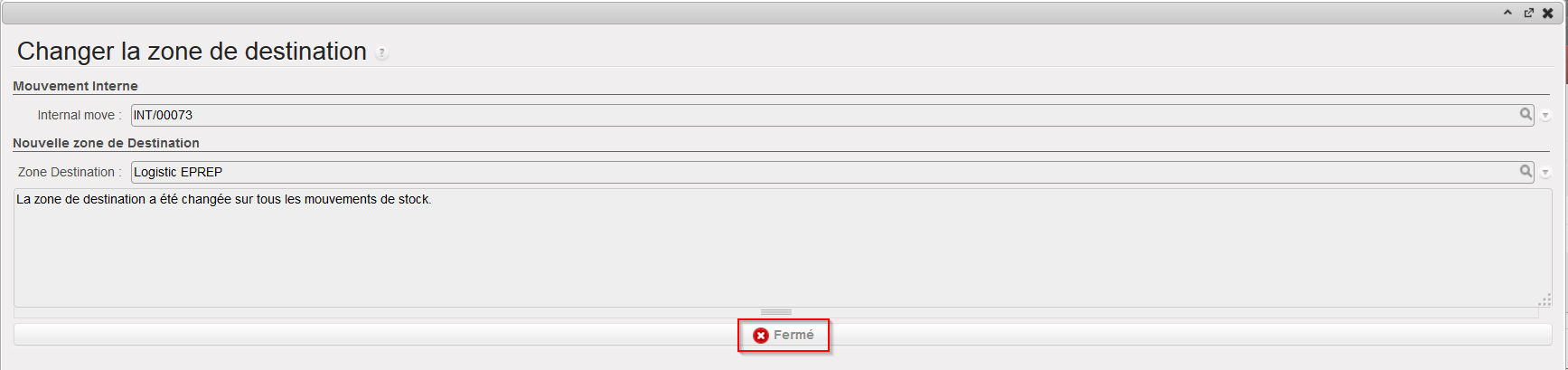 7. Sur la fenêtre “Changer la zone de destination”, entrez la zone vers laquelle vous souhaitez transférer les biens dans le champ “Zone Destination” et cliquez sur le bouton “Changer la zone”. Une fenêtre vous informe sur les changements réalisés, cliquez sur le bouton “Fermé”.