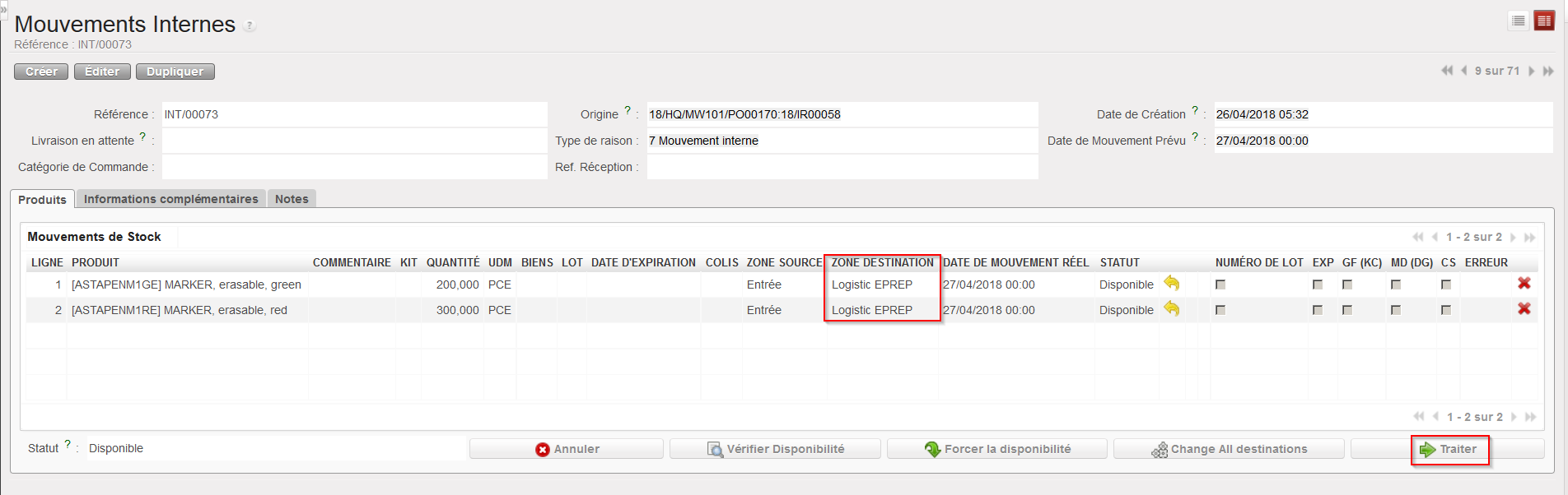 8. La zone de destination sur le INT est maintenant “Logistic EPREP”. Vous pouvez traiter le Mouvement Interne comme d’habitude via un clic sur le bouton “Traiter”.