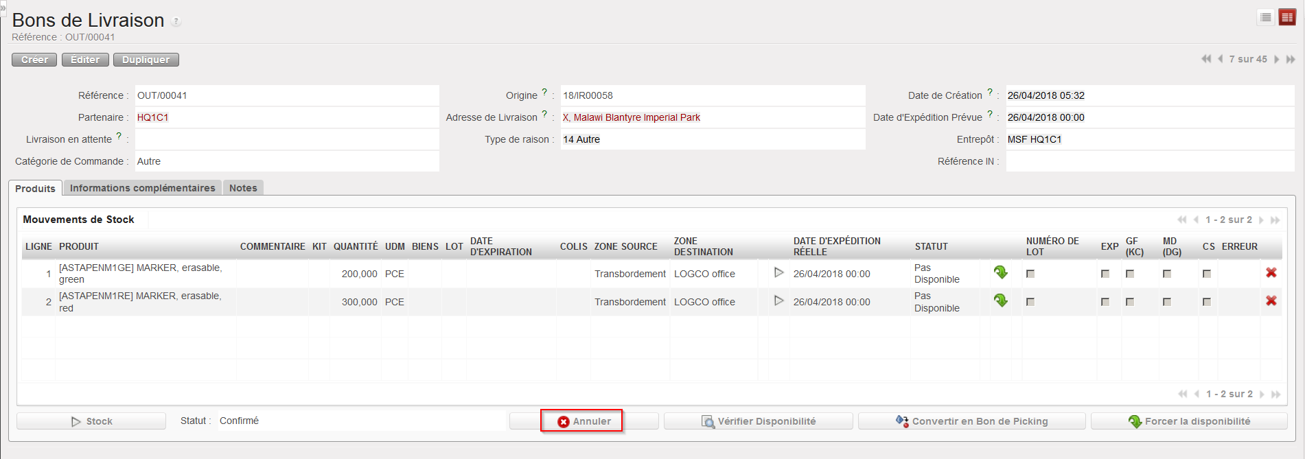 Ce processus en deux étapes peut également être utilisé pour modifier la destination prévue des marchandises comme illustré ci-dessous.