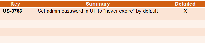 Following improvement in password policy US-7019 (UF21.0 release), all production passwords were set to expire every 6months with the exemption of sync users and unidata users. In this UF21.1 patch, we added admin user accounts to the short list of users set by default to “Password never expires”. This means that when the 6months elapse, administrator accounts will not be prompted by the system to change password.